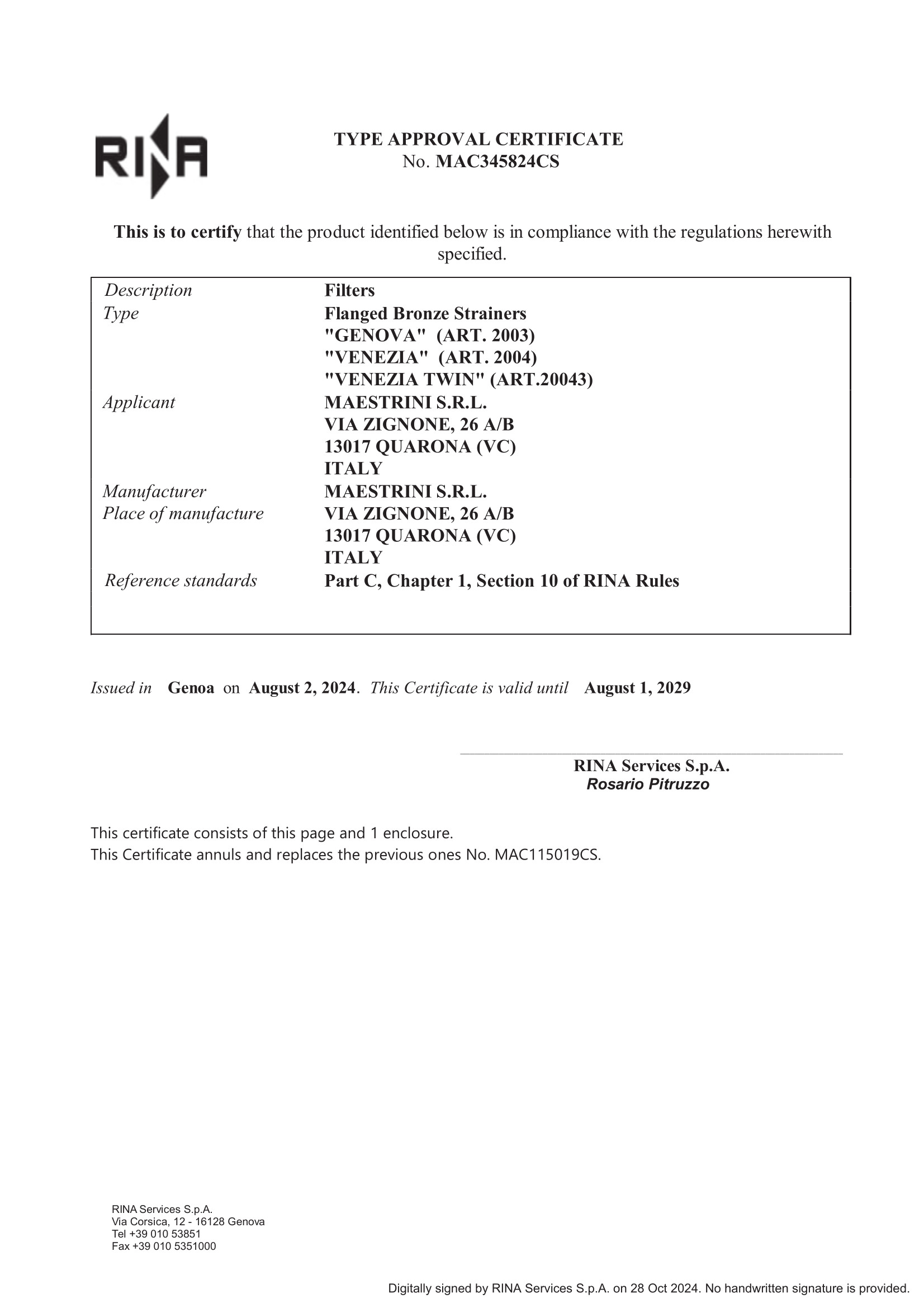 I filtri marini sono periodicamente verificati da RINA per uso diportistico e i filtri flangiati in bronzo dispongono del certificato di omologazione di tipo RINA MAC.
